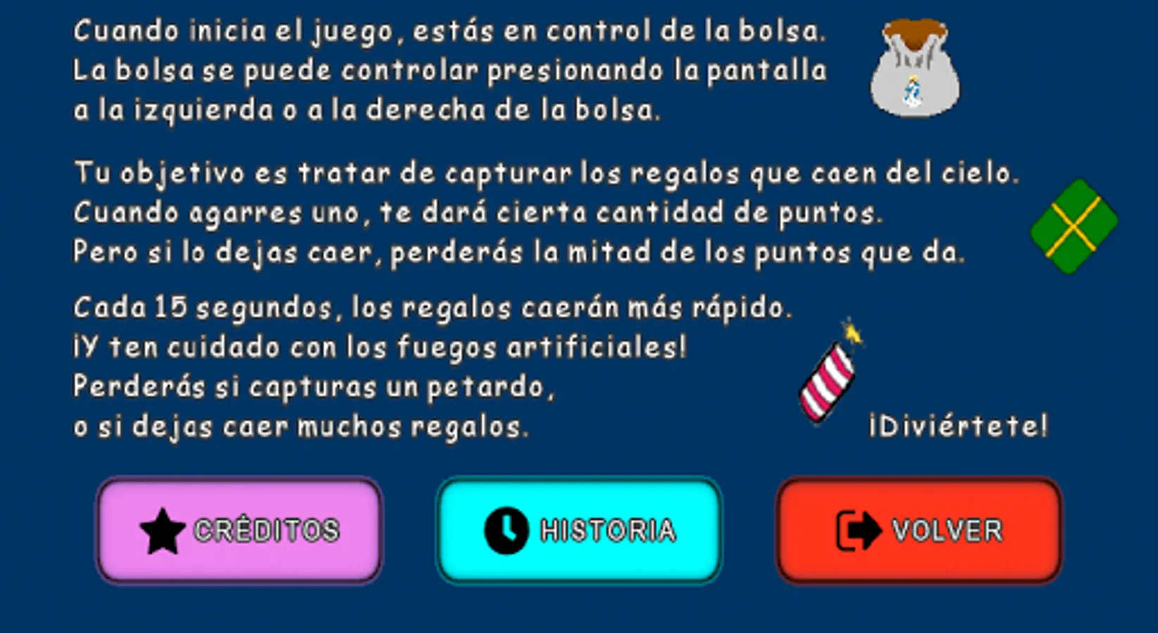 Catch the gifts that fall from the sky, pressing left or right to move the bag. Every 15 seconds, the gifts will fall faster.