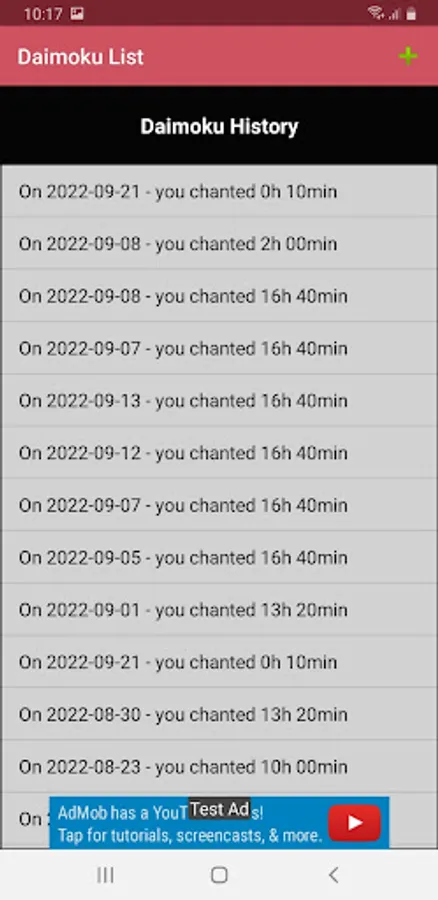 - List of performed daimoku sessions, either with automatic or manual registration;