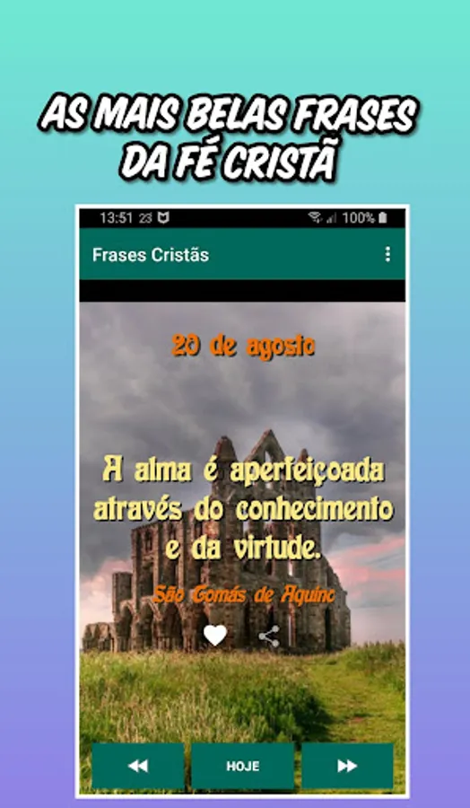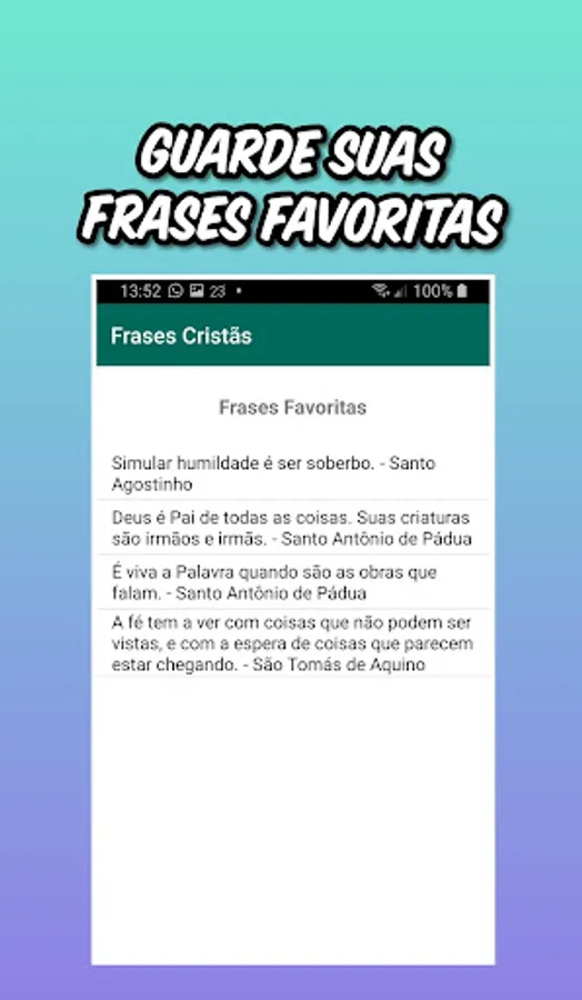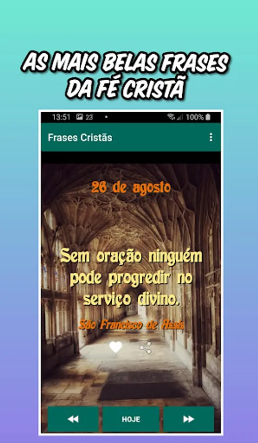 Receiving the most beautiful phrases from your favorite saints daily is the strength you want to overcome daily. Saint Augustine, Saint Thomas of Aquino, Saint Francis of Assisi, Mother Teresa and many other icons of the Catholic Church. The Christian Phrases App features:
