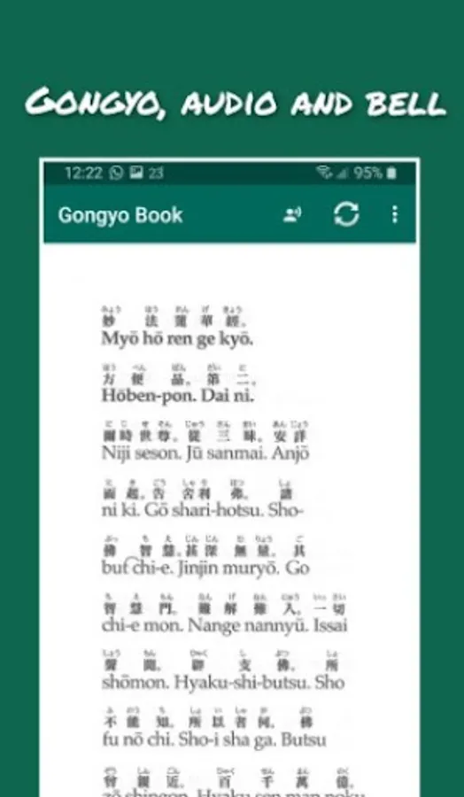 The Gongyo Book App brings to your phone the liturgy of Nichiren Daishonin/Soka Gakkai International. Available in english, french, japanese, portuguese, spanish, italian, german, polish and korean.