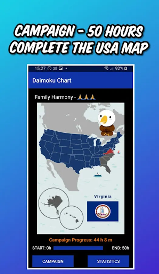 - Each stage of one hour corresponds to an AMERICAN STATE. The graph will display the status corresponding to the progress of the Campaign.