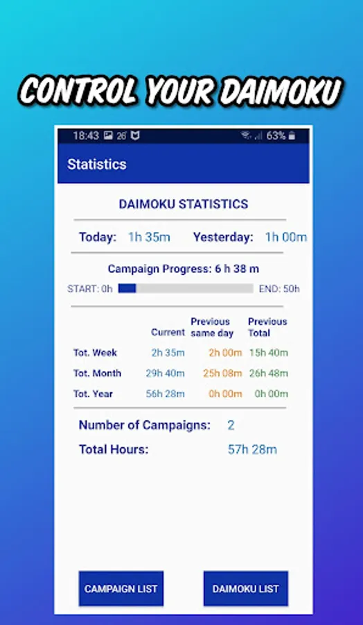 - Available Daimoku time sums: Today, Yesterday, Current week, Current month, Current year, Previous week up to the same day; Previous month up to the same day, Previous week total, Previous month total, Previous year total, Number of campaigns accomplished and in progress, Total Daimoku hours registered in the app;