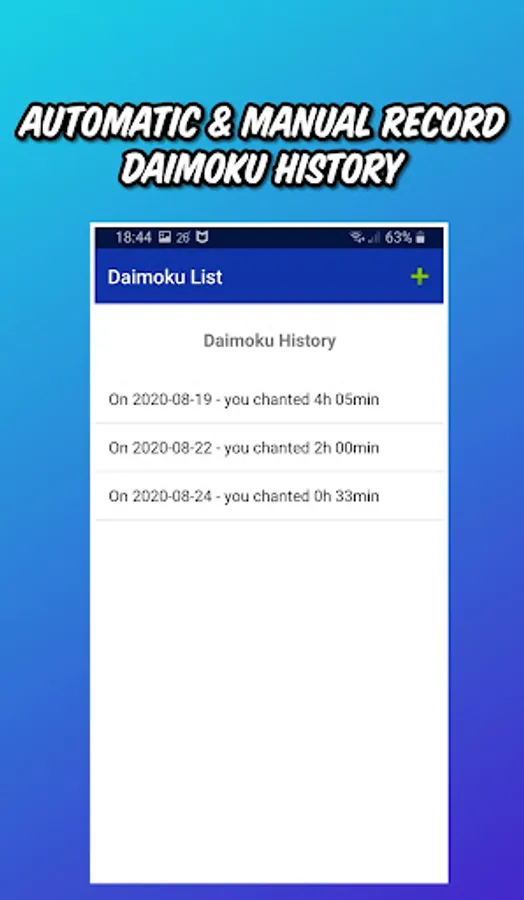 - List of performed daimoku sessions, either with automatic or manual registration;