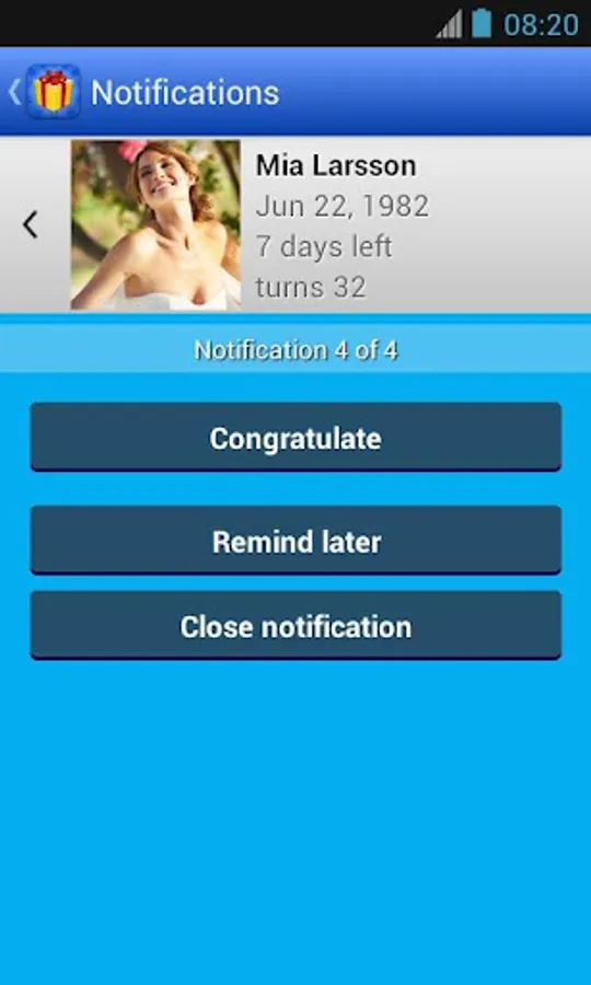 Easily send your best wishes and congratulations to your friends right from this app – via call, text message, email or messenger app.