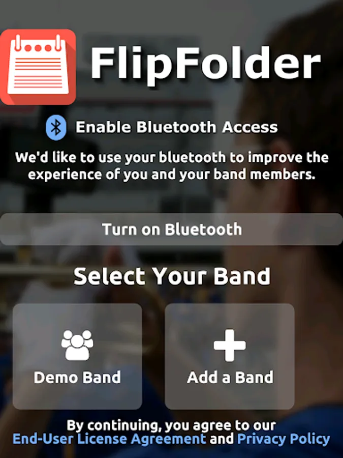 This app is an electronic music viewer and group performance manager. You set up a musical group at flipfolder.app, upload music to an online cloud, and then give other members of your group a "Connect ID". Members of your group are able to connect to your band using that ID and then view the music you upload.