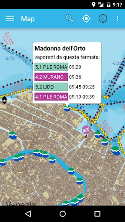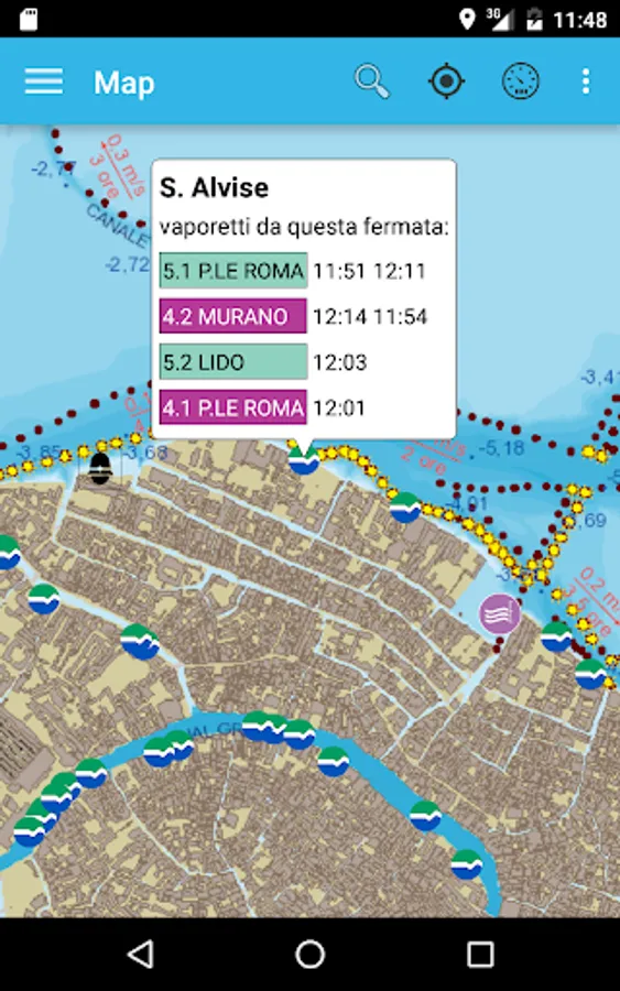 Fot those using public transport, the App shows the water-bus stops, providing informations on timetables of next arriving boats at each stop.