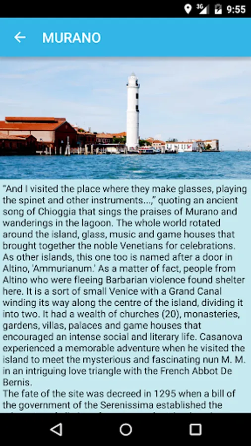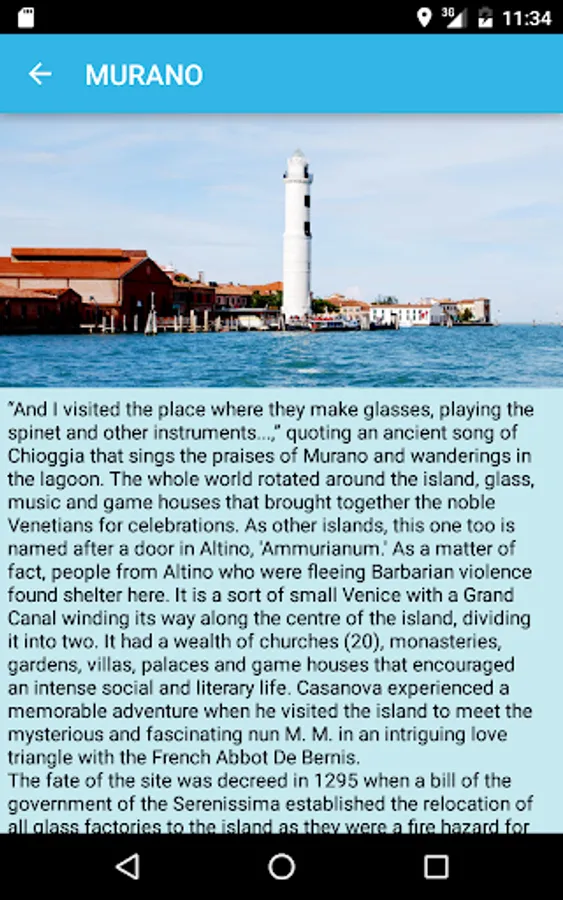 For all kinds of visitors, the App offers historical and environmental informations, island by island, for a better visit and comprehension of the today lagoon, including changes due to the restoration and safeguard works. Also available, in real time, the data on the tide, temperature and other environmental informations.