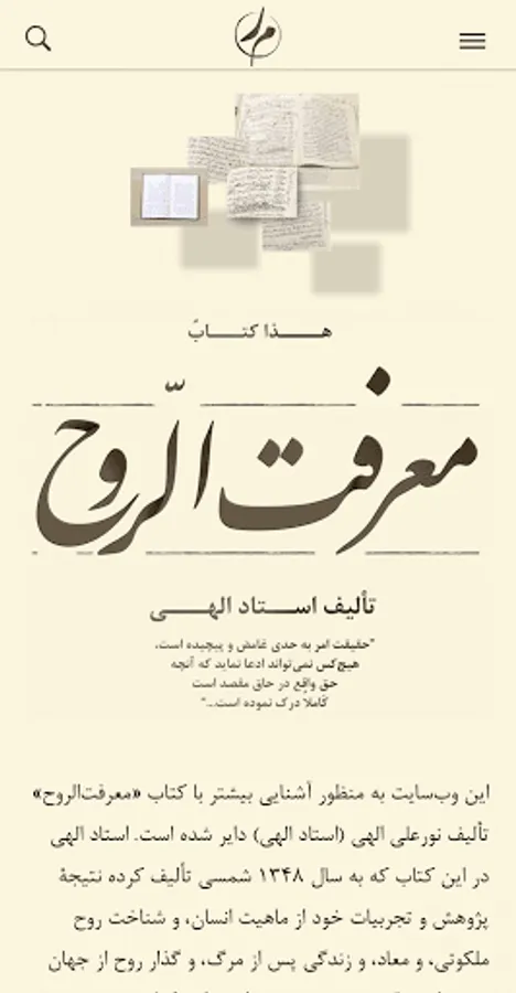 This app is intended to introduce and provide greater familiarity with the book Marefat ol-Ruh (Knowing the Spirit, 1969), the second published work of Nur Ali Elahi (later Ostad Elahi, 1895-1974). Marefat ol-Ruh represents the culmination of Ostad Elahi’s extensive theological and philosophical research, as well as his exploration of the various dimensions of the human spirit. Considered to be among his theoretical works, its publication in the second half of the 20th century suggests that Ostad Elahi was seeking to revive the discursive tradition of philosophical-theological discourse. The supplemental articles and expositions by other researchers and scholars in the field provide essential contextual background and additional analyses of Ostad Elahi’s findings.