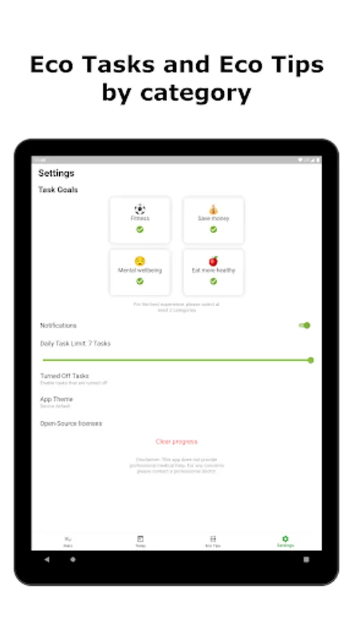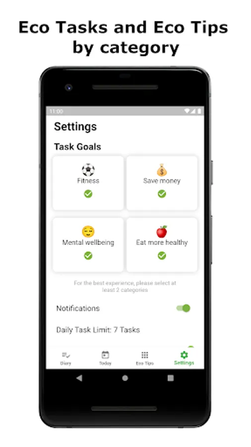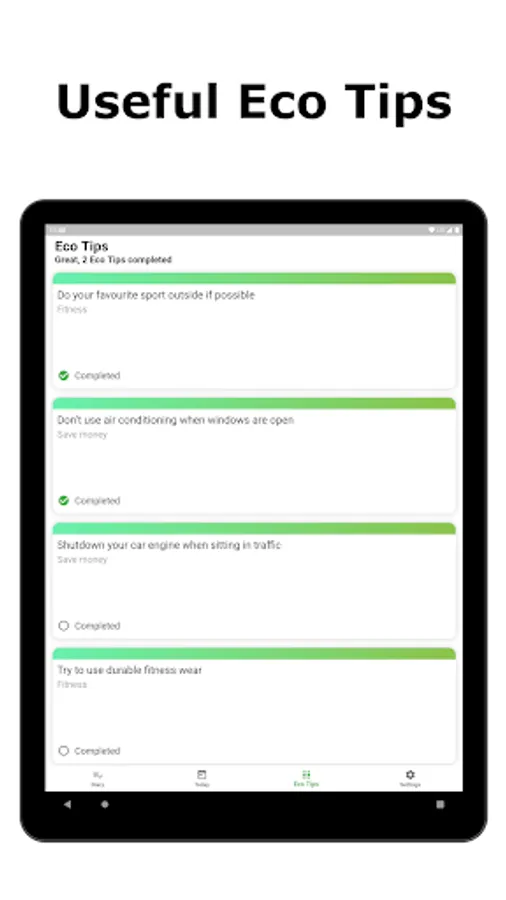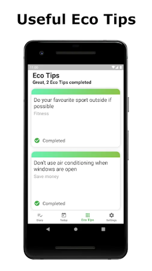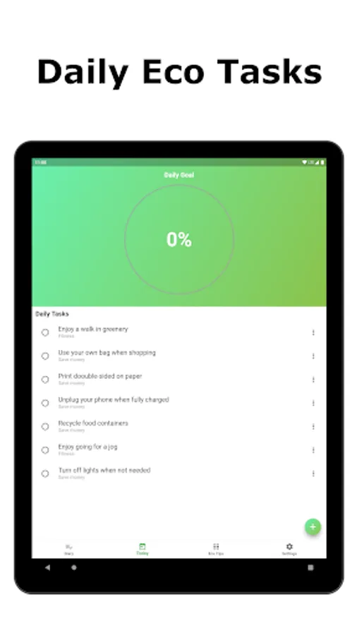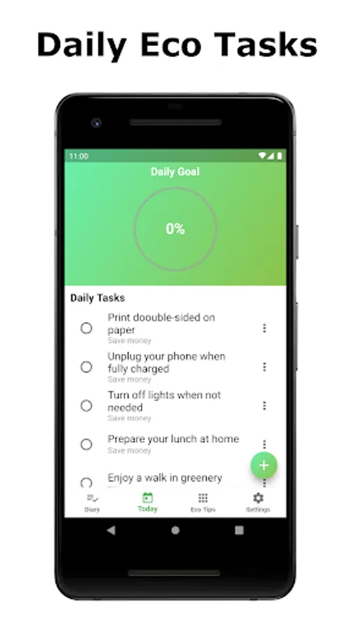Try to complete a few eco-friendly tasks every day, level up your ecology lifestyle with Eco Tips provided in the app and check your progress in the diary.