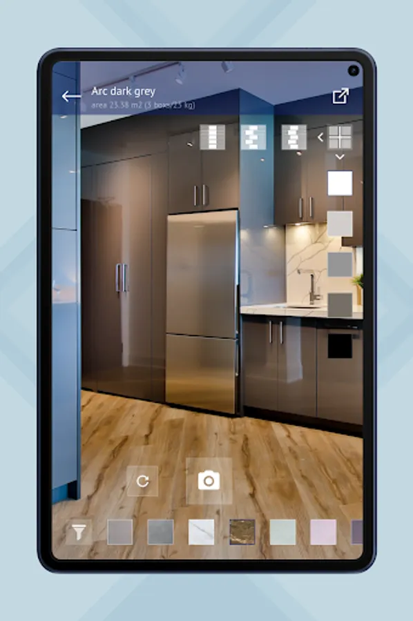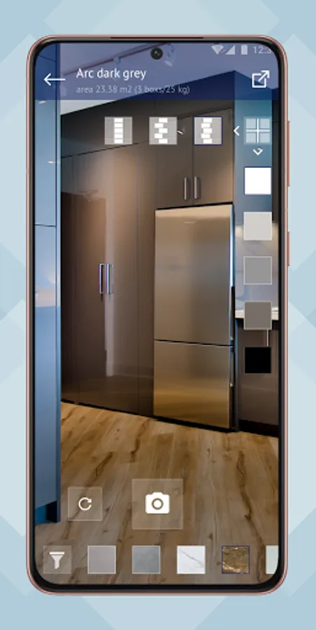 View your interior from different angles. Play with the laying pattern of the tiles and the color of the joints. Ready? Take a photo or video of the most successful creations and share it with your friends and family on social media. Or download all your ideas and compare them.