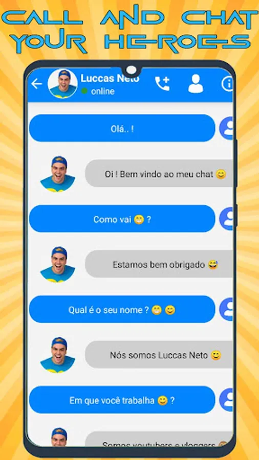 Luccas Neto Call is an excellent application directed to fans of Luccas Neto game. It is easy to use choose your option Luccas Neto call video or Voice and have a chat conversation with your Hero .