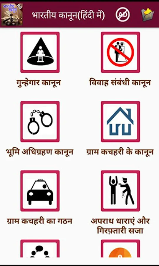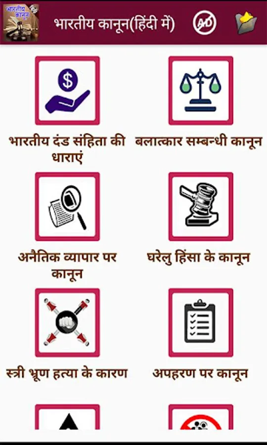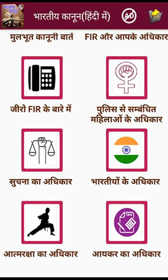 भारत का कानून आधुनिक भारत में कानून की व्यवस्था को संदर्भित करता है।भारतीय संविधान के मसौदे के बाद से, भारतीय कानून मानवाधिकार कानून और पर्यावरण कानून पर संयुक्त राष्ट्र के दिशानिर्देशों का भी पालन करते हैं। इस अप्प में भारत के कानून के बारे में विस्तारपूर्वक बताया गया है | इस अप्प में भारतीय दंड की धराये ,अपराध धराये और अपराध की सजा , मूलभूत क़ानूनी बाटे ,पुलिस और जनता के अधिकार , और ऐसे अन्य क़ानूनोंकी जानकरी दी गयी है | इस अप्प के इस्तेमाल से आपको भारतीय क़ानूनोंको जानने और समझने में आसानी होगी | भारतीय कानून में रूचि रखनेवालों के लिए महत्वपूर्ण अप्प.इस अप्प में आप महत्त्व पूर्ण कानून मनपसंद जानकारी नामक सूचि में स्टोर कर सकते है और उसे शेयर भी कर सकते है |