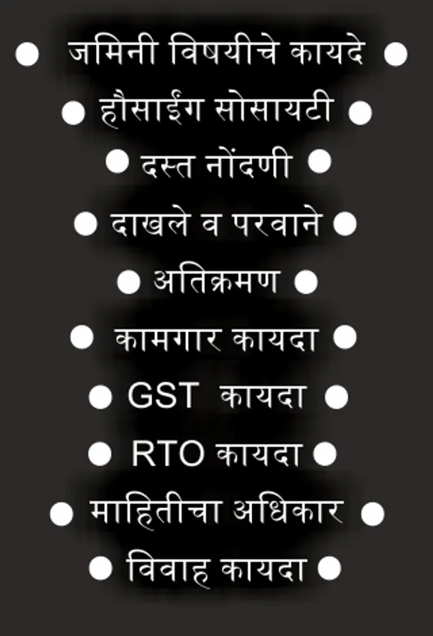 हे अँप सर्वसामान्यांच्या सेवेसाठी बनवले आहे, तज्ञ वकिलांच्या मार्गदशना नुसार बनवले आहे. तरी आपणास काही नवीन कायदे अँप मध्ये सामील करावयाचे असल्यास आपण margaloo.apps@gmail.com या इमेलवर मेल करावा हि विनंती.