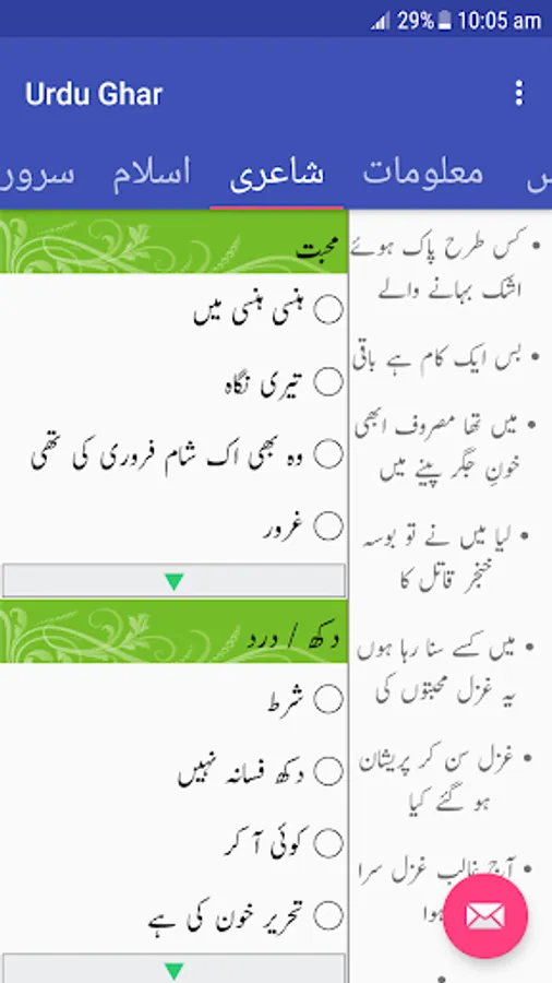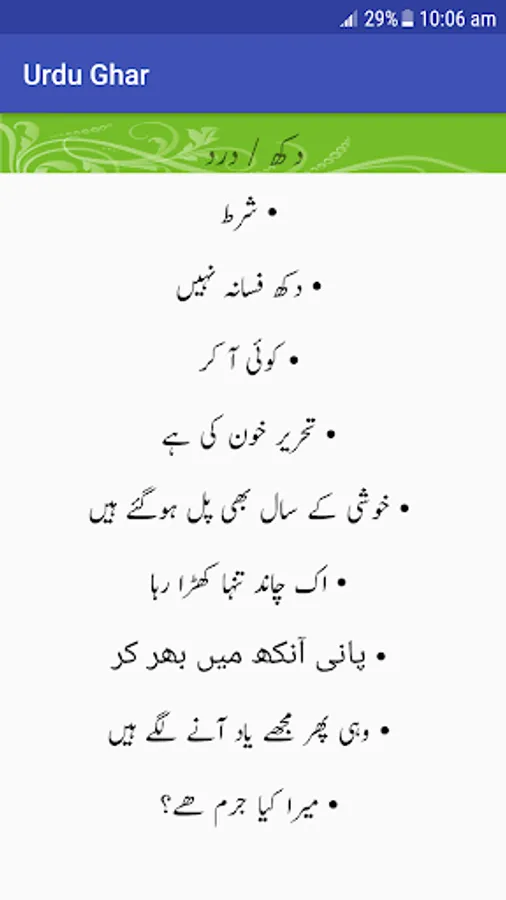 Urdu ghar is enrich with urdu material. It includes each and everything related with urdu. Hope the users will love Urdu ghar. This app has categories about every section. It includes the topics about;