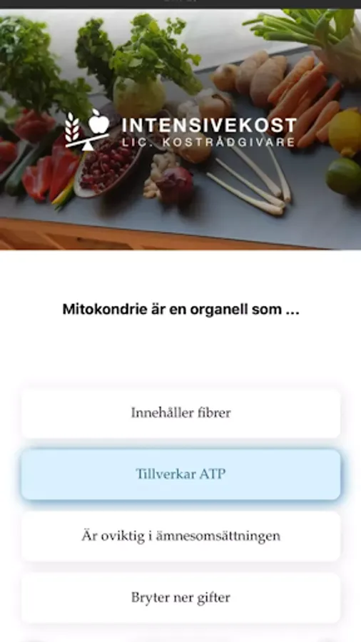 Testa dina kunskaper i kost med Intensivekost quiz app! En app för dig som studerar eller är intresserad av kost och hälsa. Vi på IntensiveKost erbjuder en intensivutbildning i kostrådgivning på distans. Kvalitetssäkrad och godkänd av Kroppsterapeuternas Yrkesförbund.