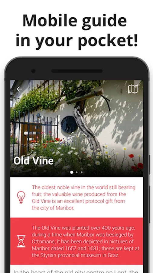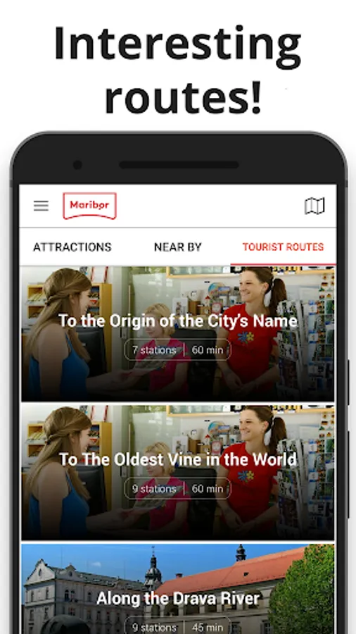 You do not know where to start? The application informs you which sights are located near the location where you are located, and in addition to this, it will offer you to discover Maribor through four thematic trails - To explore the origin of the city’s name ǀ To the oldest vine in the world ǀ By the river Drava to the oldest part of the city ǀ To discover where the old city walls used to be.