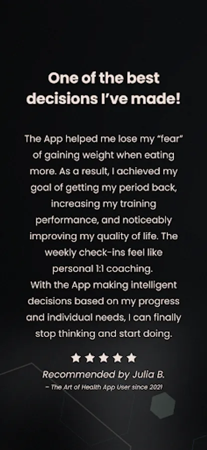 We strongly believe that everyone possesses a huge physical and mental potential that remains untapped. Our vision is to help you recognize this potential and make full use of it. We support you during your transformation and reach the best health and life quality possible together. Why can we do this? We developed an algorithm called The Art of Health app that makes personalized decisions for you based on scientific evidence. This algorithm takes into account your personal health factors such as sleep, stress level, energy & performance and hormonal changes and provides you with weekly adjustments such as adaptations of your calorie intake.