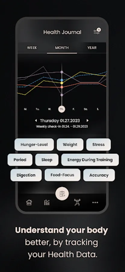 • Use the health journal to track your progress in terms of health data such as weight, sleep, stress level, digestion and ovulation