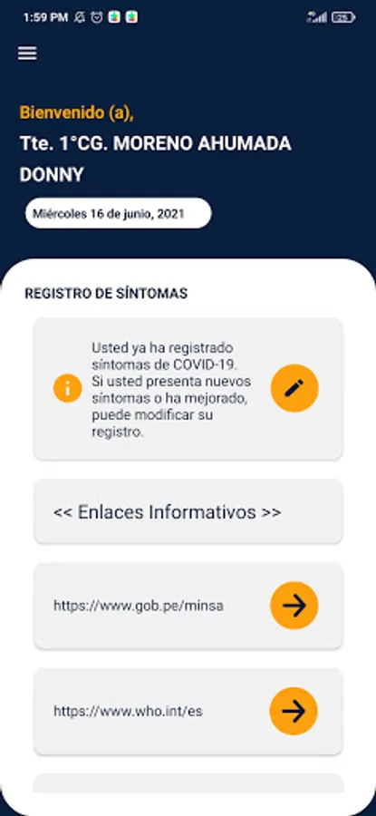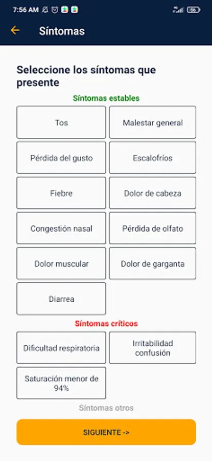 App developed in order to support the fight against the spread of the pandemic, which will allow naval personnel and direct family members to register their symptoms, these symptoms will be reviewed by a team of medical specialists who will evaluate said symptoms and carry out the respective follow-up. depending on the diagnosis.