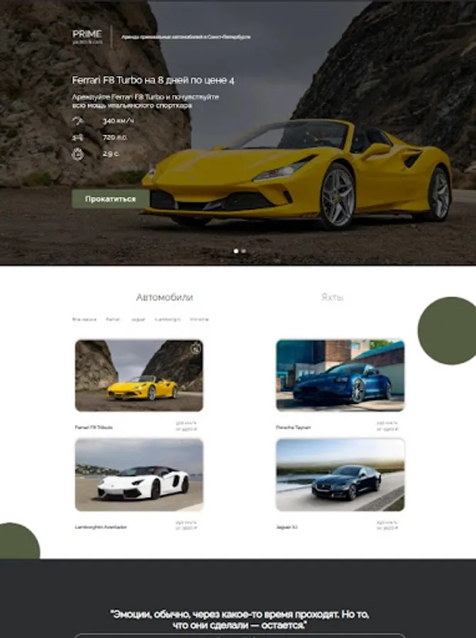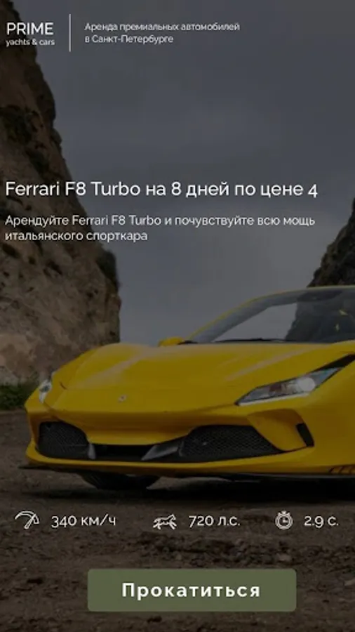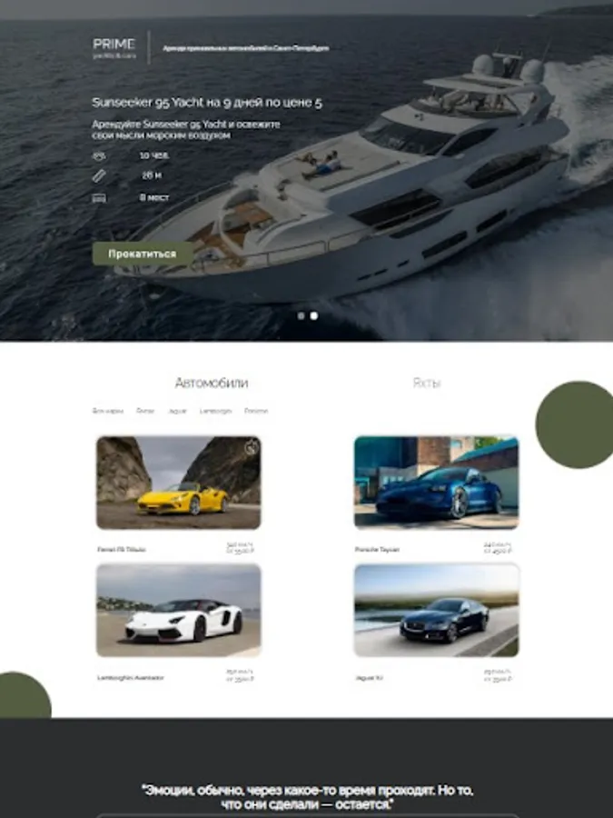 PRIME is an application for renting premium cars and yachts in St. Petersburg. It allows you to choose the model of transport you are interested in, study its characteristics and leave a booking request to the manager for further clarification of the information.