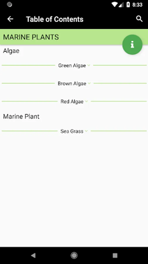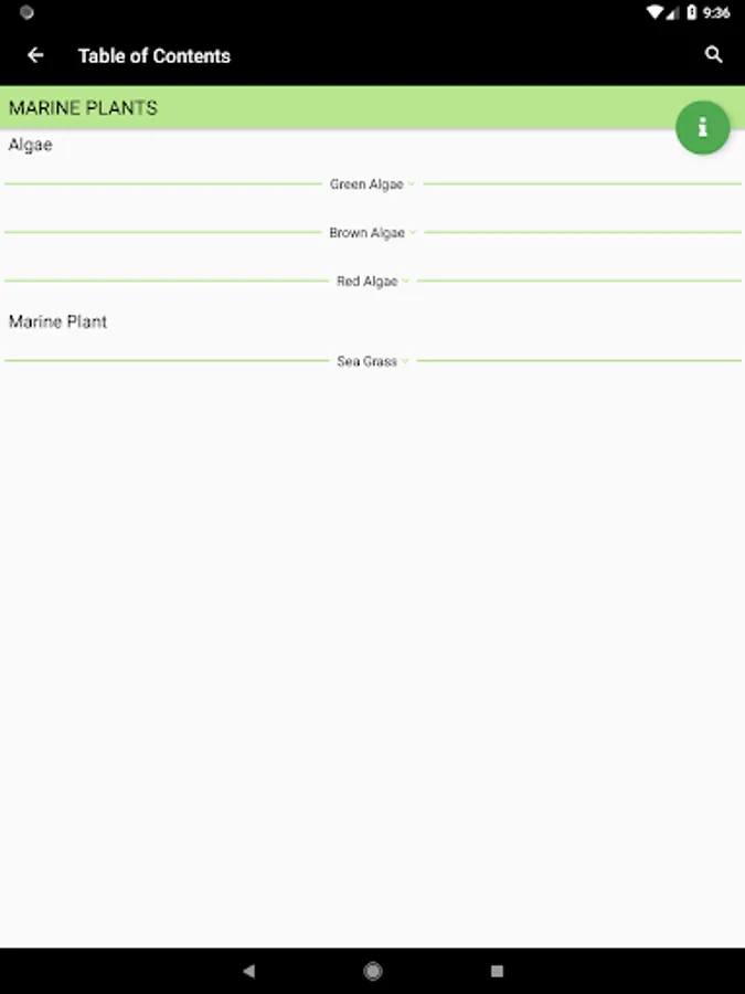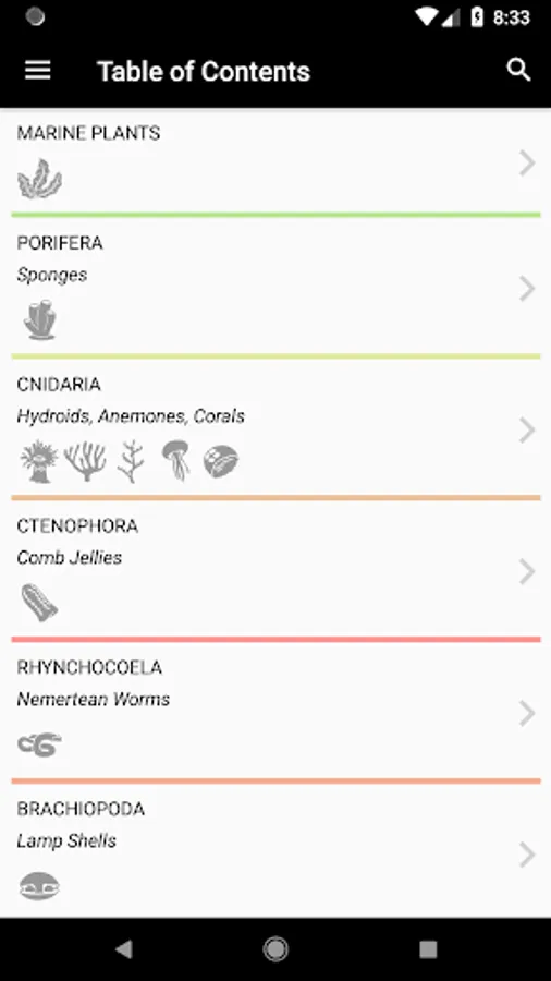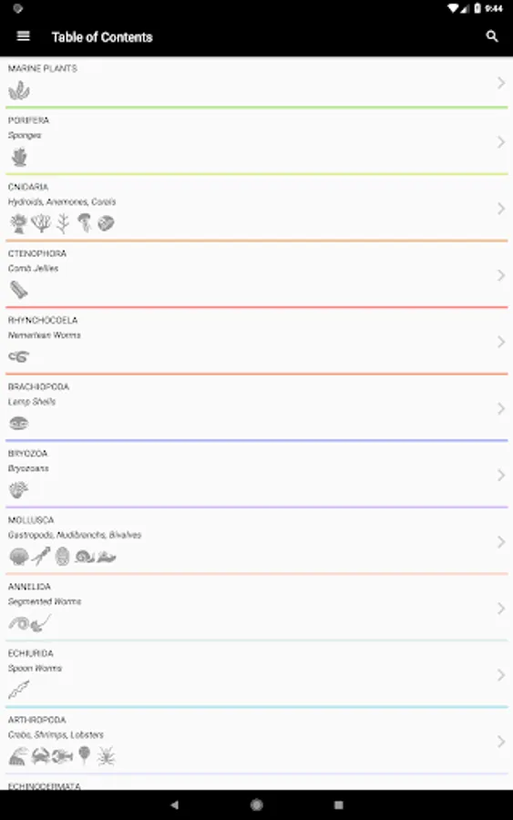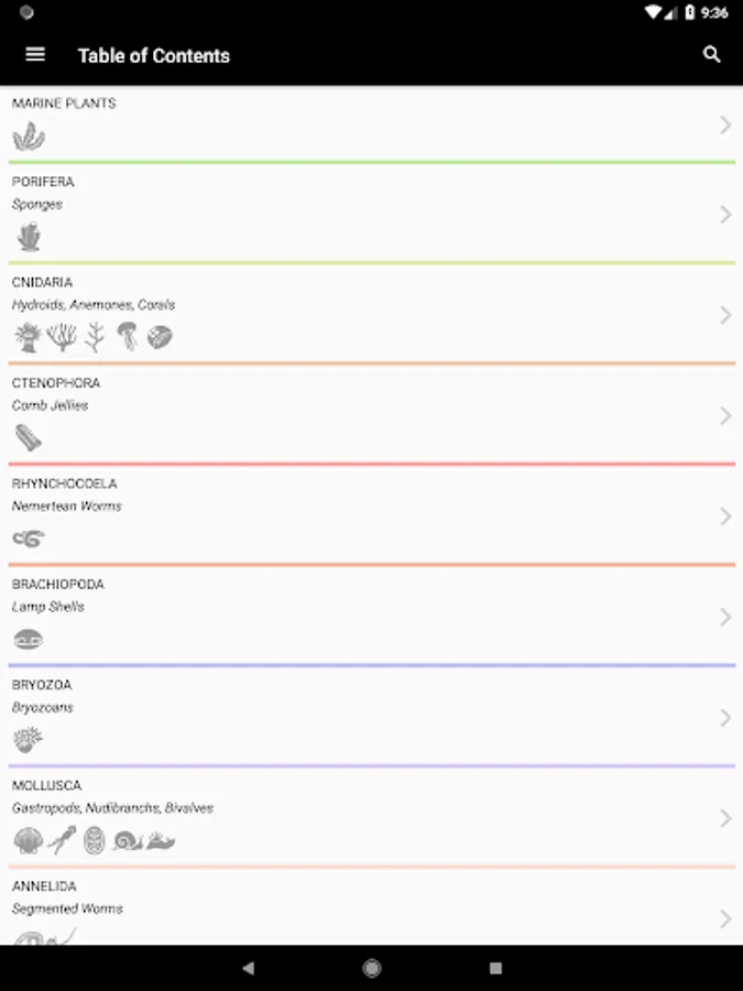 The book section of this app is divided into clear, color coded and easy to navigate chapters/phylum.