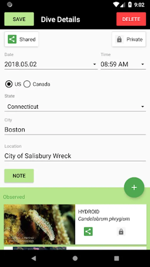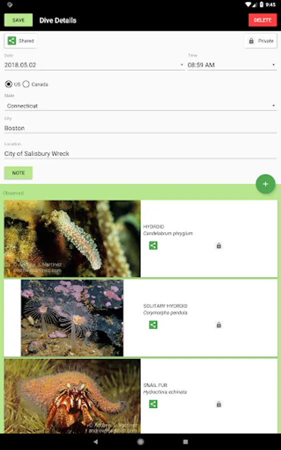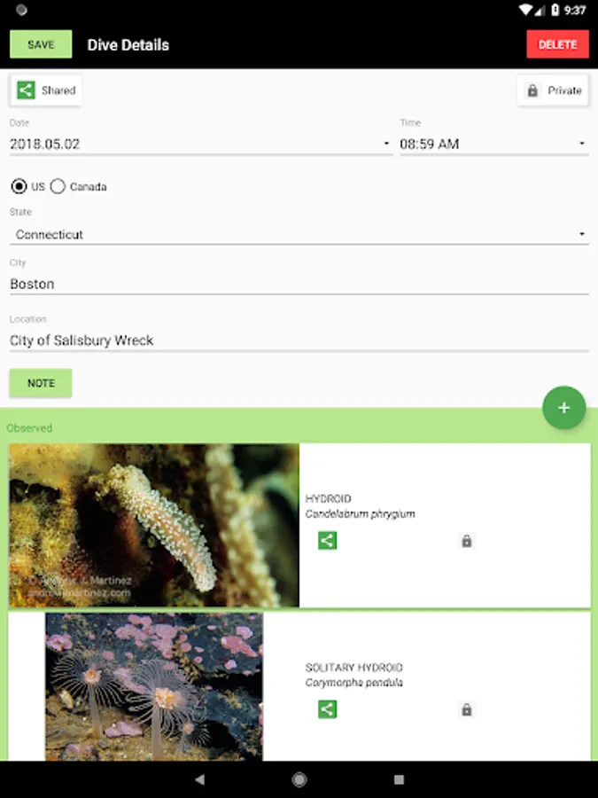 This feature is a pictorial record of the plants or animals you have seen during your dive or just a walk on the beach it is not designed to replace your traditional dive log. It is a wonderful tool for divers, citizen scientists, and lovers of nature to record their observations of marine life when and where they were found.