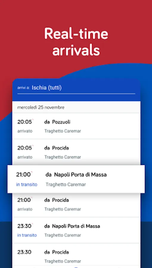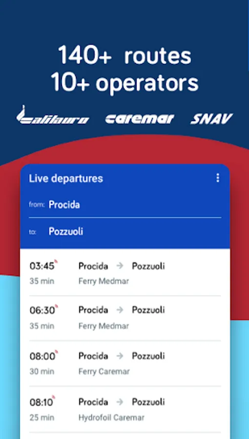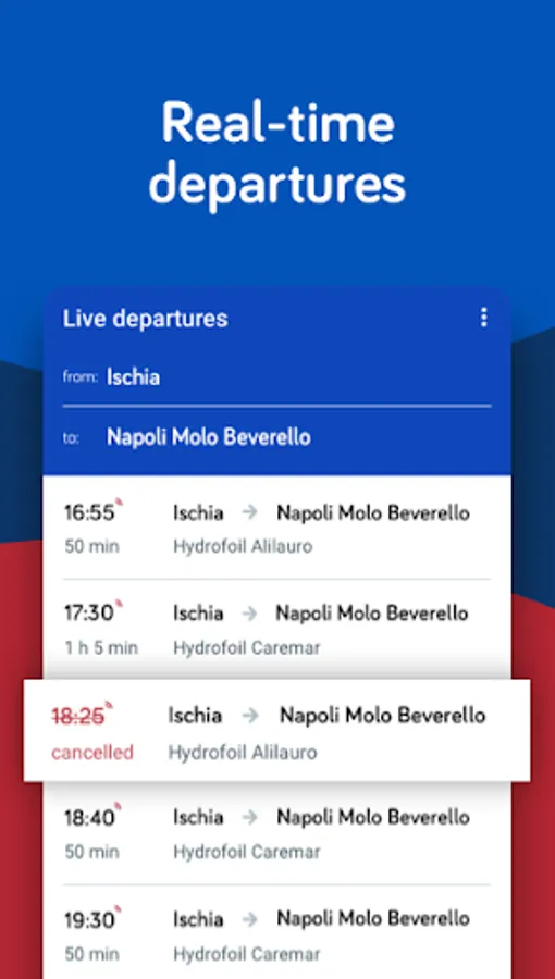 Get real-time information on departures changes and cancellations (for Alilauro, Caremar, Medmar and Snav).