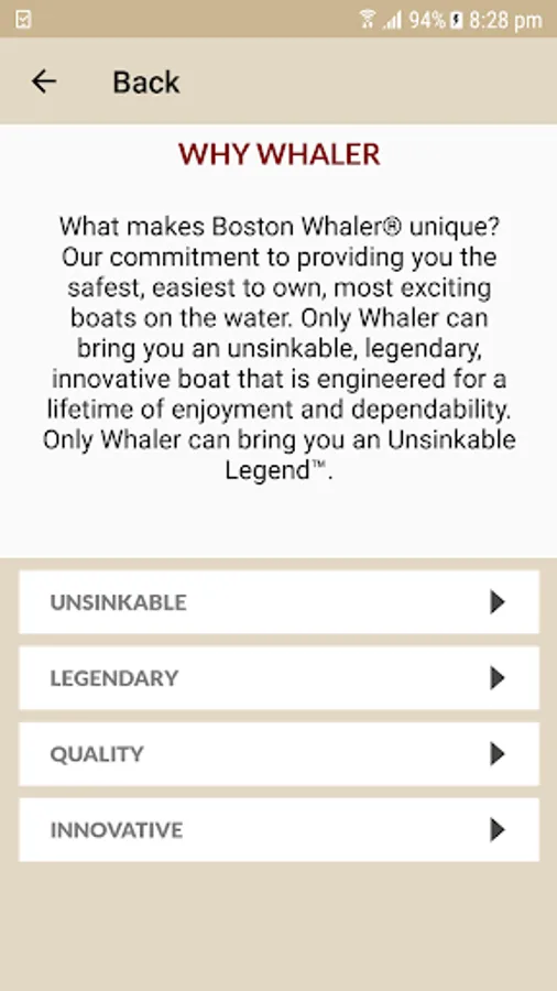 The Boston Whaler Unsinkable App provides owners, fans and boating enthusiasts alike with convenient access to critical boating, fishing and cruising information. The app also contains a variety of Boston Whaler content -- including all model information, videos, photos and other details. Other tools of the app include links to local weather forecasts and tides, Whaler events and rendezvous, and fast access to Boston Whaler’s social networking sites. The Boston Whaler Unsinkable App is a portal into the Whaler lifestyle, right in the palm of your hands!