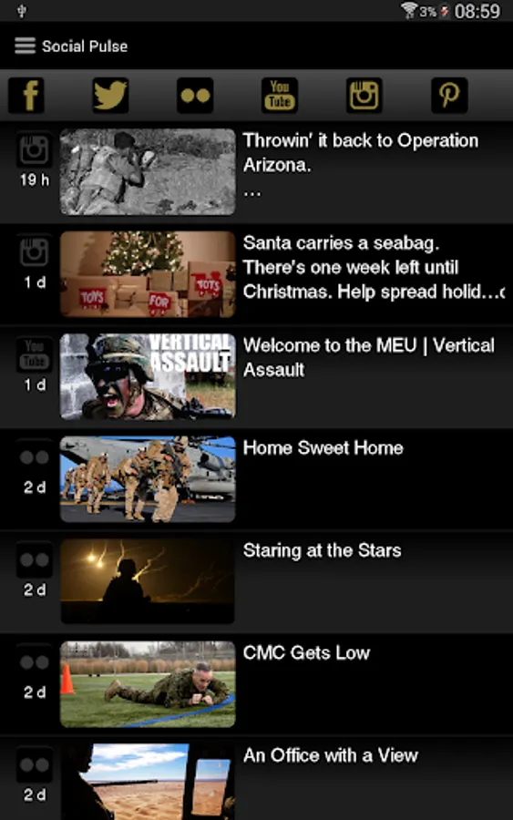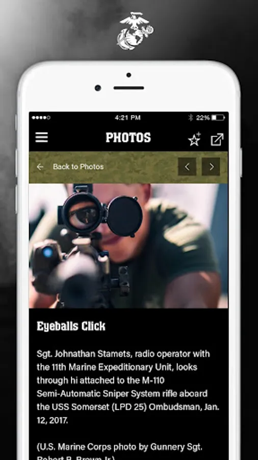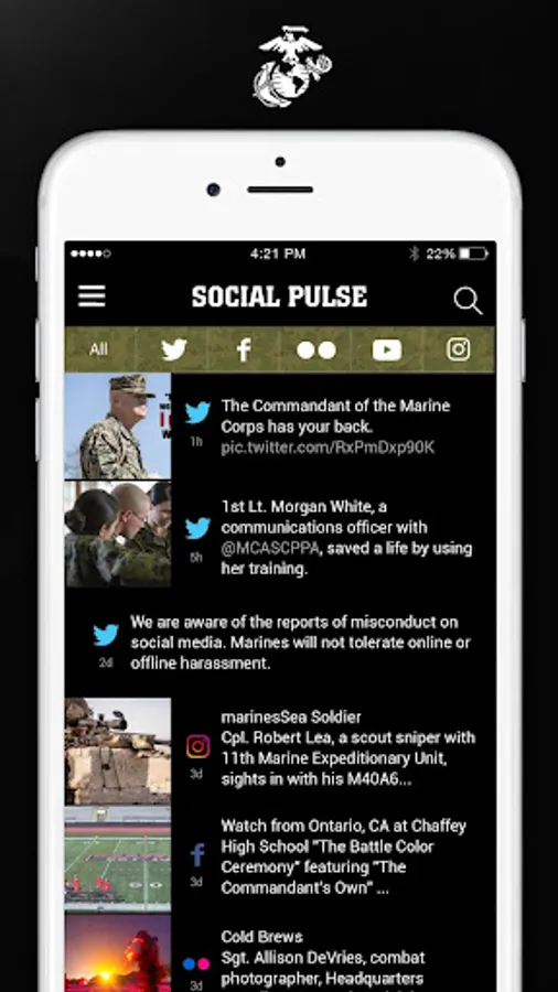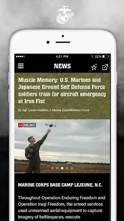 Get up to the minute news and information from the United States Marine Corps on its official mobile app. View the latest news, photos, videos, press releases, Marine messages, orders, and directives. Keep up-to-date with an aggregated social media feed from all the Marine Corps' social media platforms. Calculate and track your PFT and CFT score. Share content from app to your social media sites. Save items to your favorites for easy access and offline viewing. Opt-in to push notifications on important news from the U.S. Marine Corps.