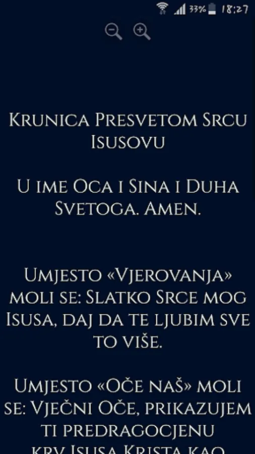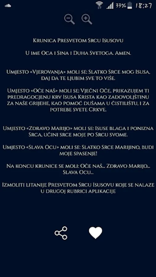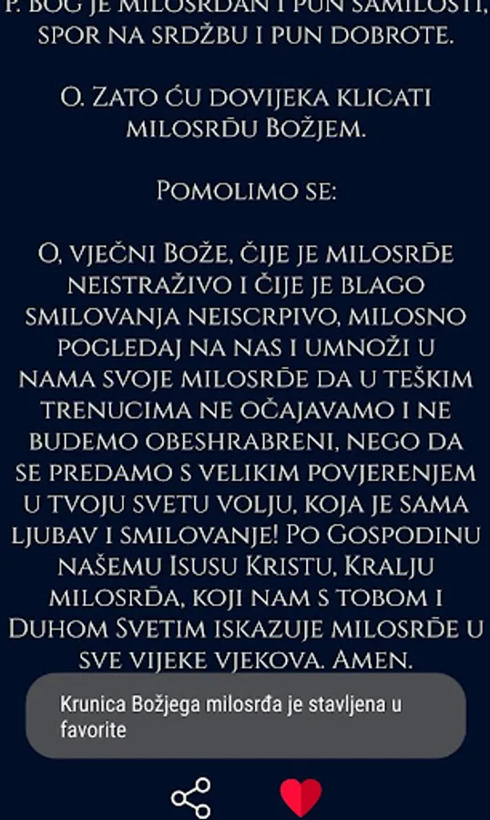 Prayer is under construction and contains explicitly Catholic prayers. Prayers can be saved to Favorites, prayer can be removed from the favorites, and prayers can be sent (Share) to anyone over whatsup's, Viber, email and so on.