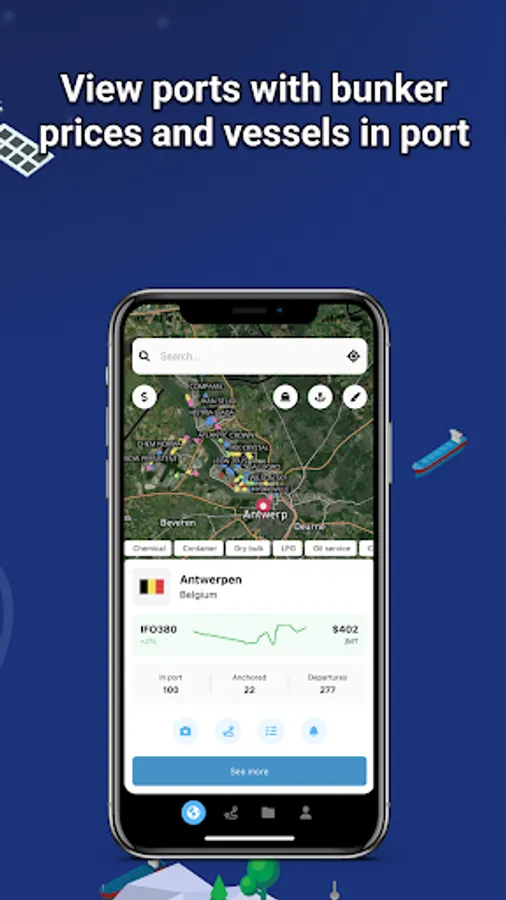 Find canals restrictions, view vessels waiting at anchorage, study the activity of the ports, and quickly find real-time bunker prices and availability in more than 5 200 ports.