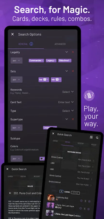 - Advanced search - Quickly find any card, any types, any printing, any artist, any colors (and more filters available).