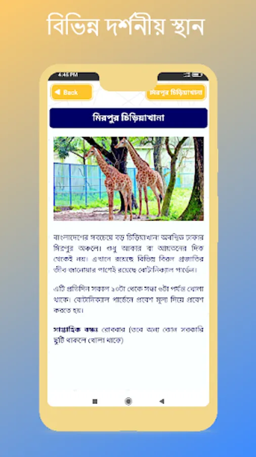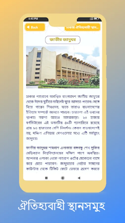 এছাড়াও জানতে পারবেন ঢাকার মসলিনের ঐতিহ্য পরম্পরা, ঐতিহ্যবাহী খাবার ও স্থান সমুহ সম্পর্কে। বিভিন্ন দর্শনীয় স্থান সমুহের সময়সূচী জানতে আমাদের অ্যাপটি আপনাদের সাহায্য করবে। আরও জানতে পারবেন দর্শনীয় স্থান সমুহের সাপ্তাহিক বন্ধের দিন ও প্রবেশ মুল্য।