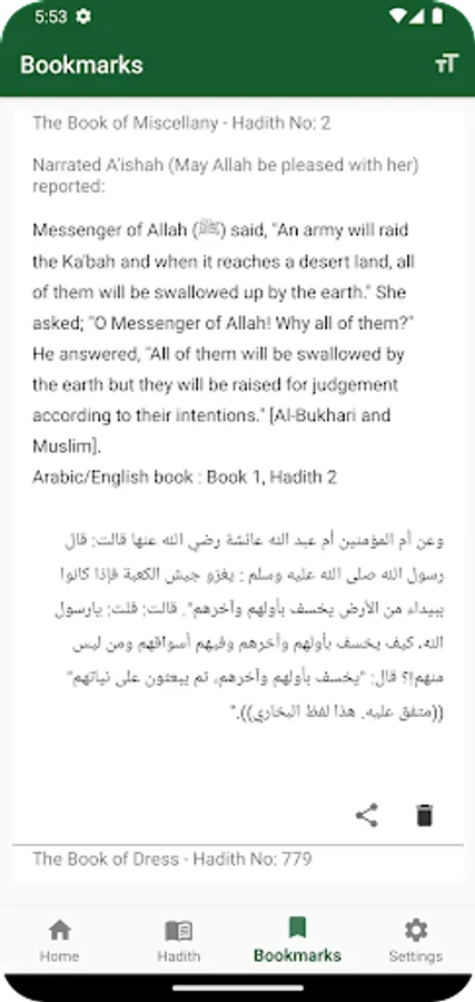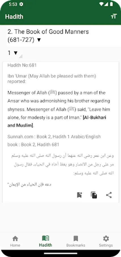 4. Bookmark and Favorites: Mark your favorite hadiths for easy access and create personalized collections. Whether you want to revisit them later or compile a set of hadiths on a specific theme, this feature allows you to tailor your learning experience to your interests and needs.