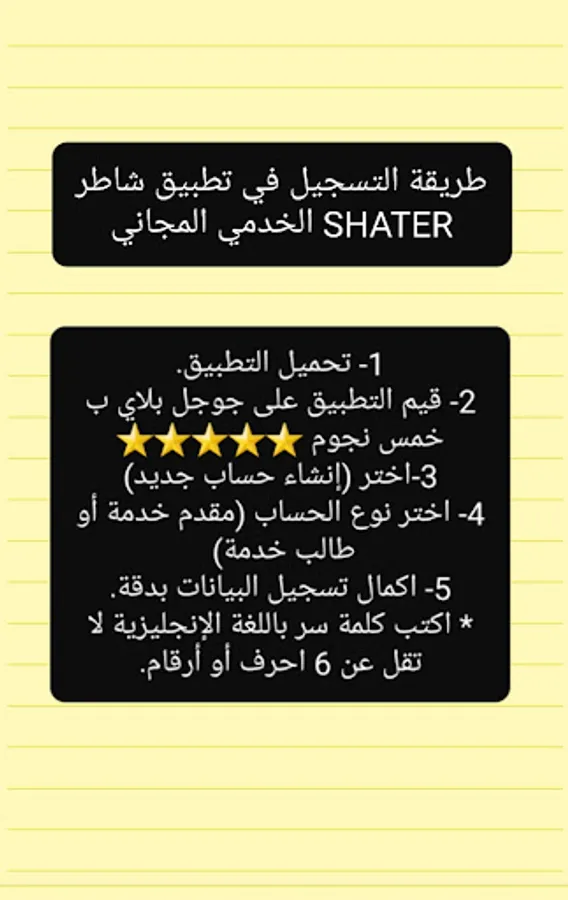 ** تطبيق شاطر يغنيك عن العديد من التطبيقات التي يزدحم بها هاتفك ، إذا كنت مقدم لخدمة ما فما عليك إلا التسجيل في التطبيق وإنشاء صفحتك الخاصة بما تحتويه من معلومات وصور وشهادات خبرة عن نشاطك وسيقوم طالبو الخدمة بالاتصال بك مباشرة أو عن طريق الواتس.