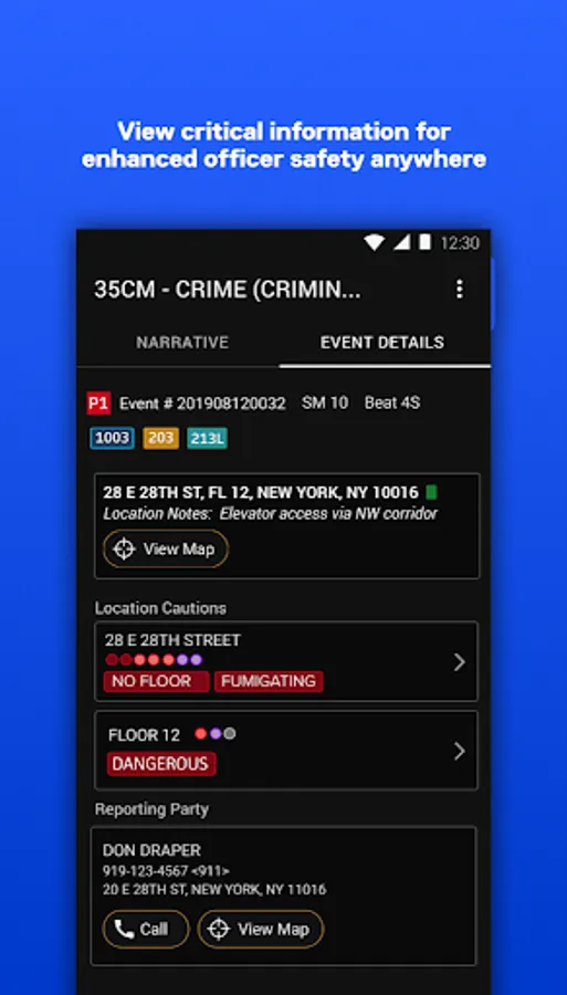 Real time event details, including narrative updates and location cautions that sync between dispatch, your MDT, and your smartphone mean that you receive up to the second alerts as situations evolve. And with state of the art security features, know that information kept in the app is secure.