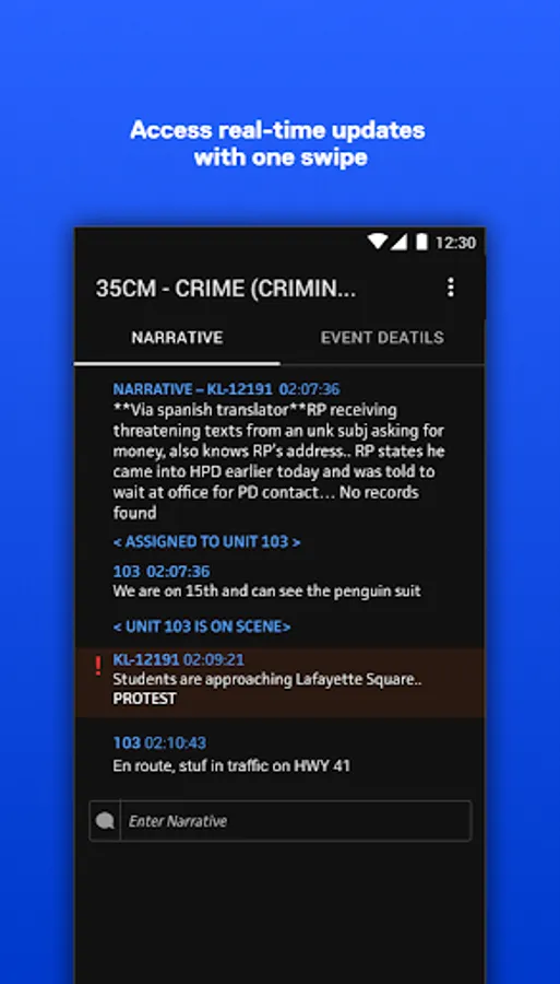 Engage directly with dispatch and view critical information about assignments, including realtime unit movements. View assigned events and receive critical reporting party information and location with only a few taps.
