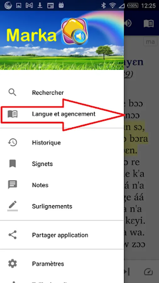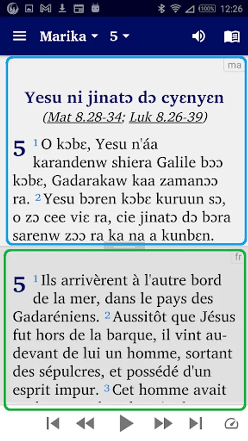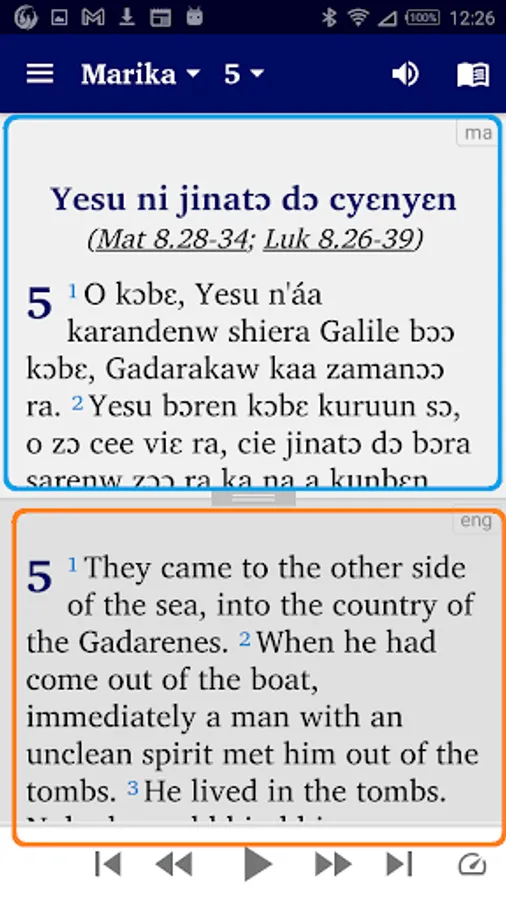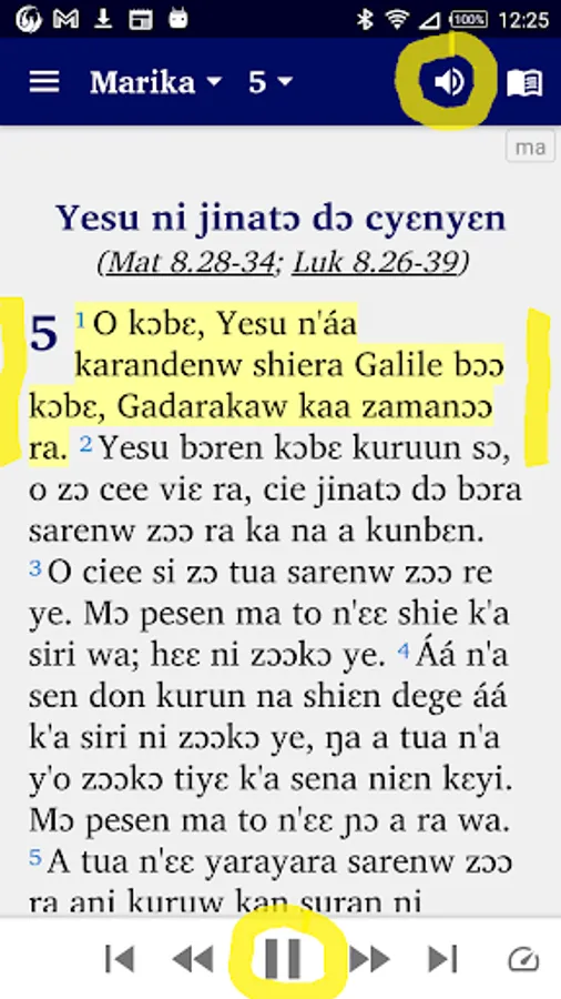 When you turn on the audio by clicking the speaker icon on the top right, the app will play the audio files of the gospel according to Mark and you can read and listen to the marka at the same time.