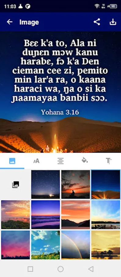 • When you tap on a verse, an image button is displayed on the bottom toolbar. When this button is pressed, the screen appears. You can choose the background image, move the text around the image, change the font, text size, alignment, format and color. the final image can be saved on the device and shared with others.