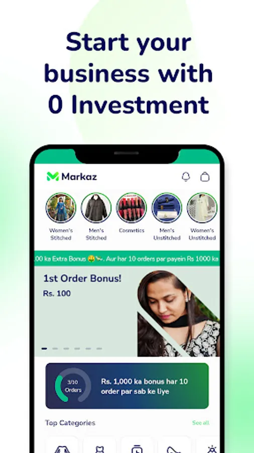 Install Markaz App π±: Install the App and start your own business without any investment. Register your phone number and your business name to start using the App.