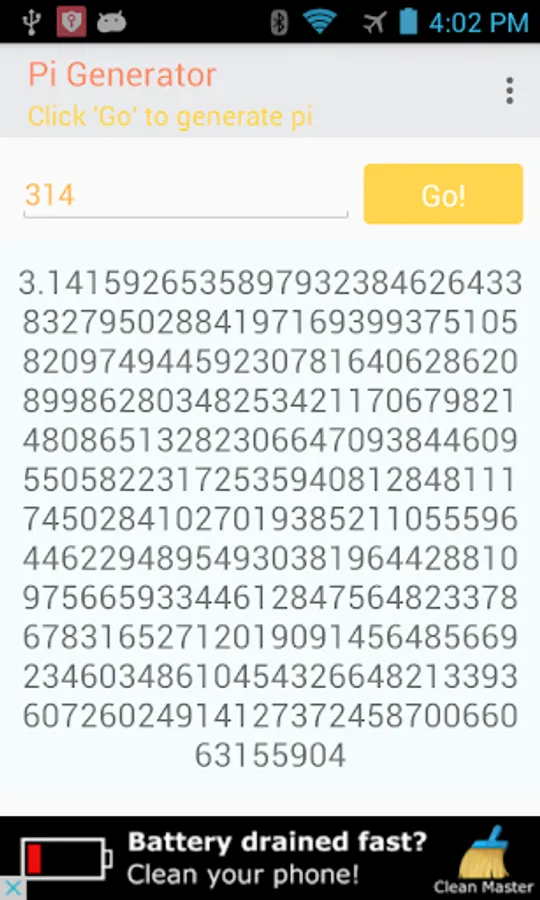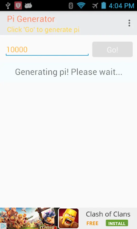 A simple Pi generator. Generates a maximum of 3500, no 10000 digits of Pi in the latest version! Would you like to see more? Can your phone handle Pi? If you'd like to see more digits just let me know.