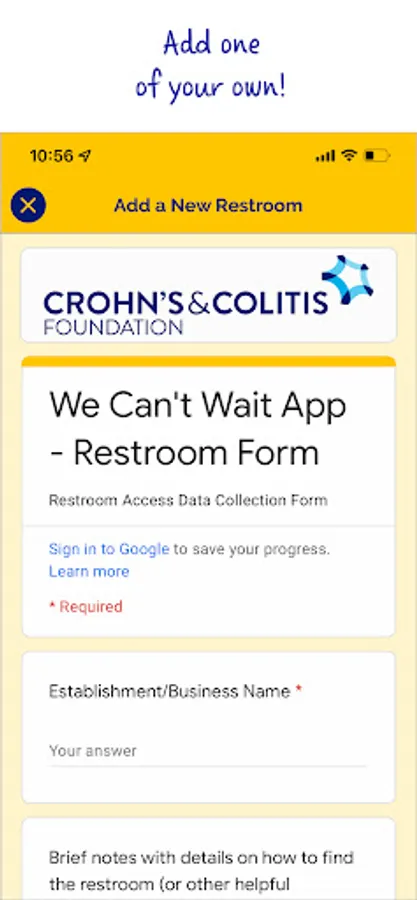 The “We Can’t Wait” app offers Crohn’s & colitis patients and others a simple and fast way to locate publicly accessible restrooms and helps identify sympathetic establishments.