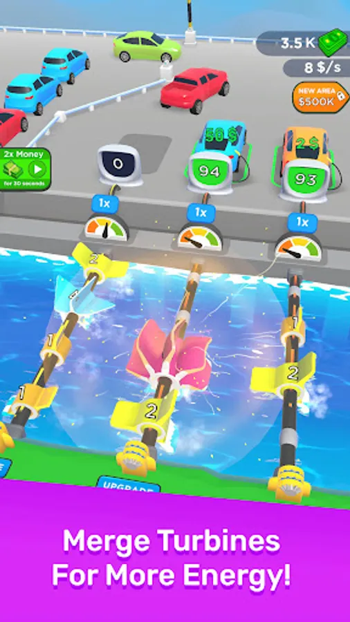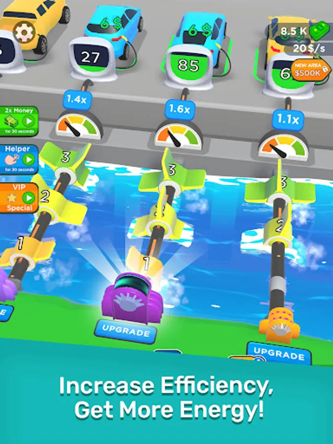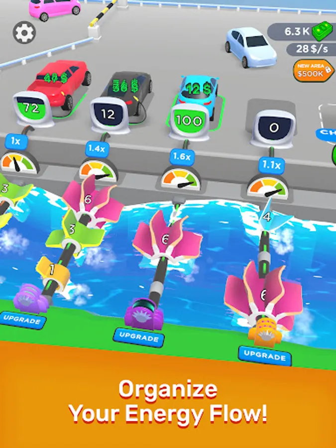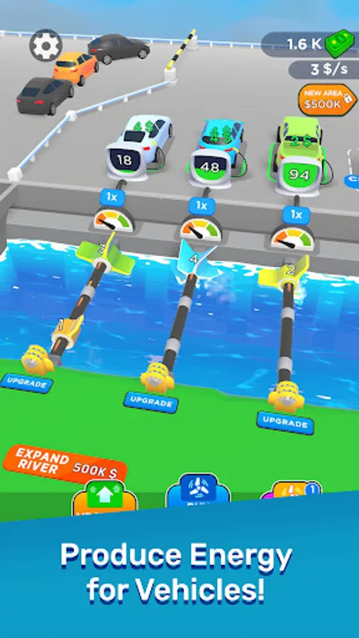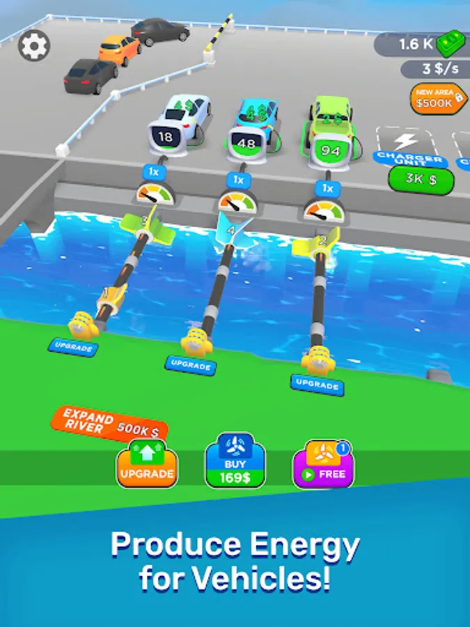 Generate energy by establishing power plants around a river and use it to power the charging stations. Earn money as vehicles charge and use it to purchase new and more powerful reels. As you progress, merge reels to create even more powerful charging stations and expand your network to meet the growing demand for electric vehicle charging.