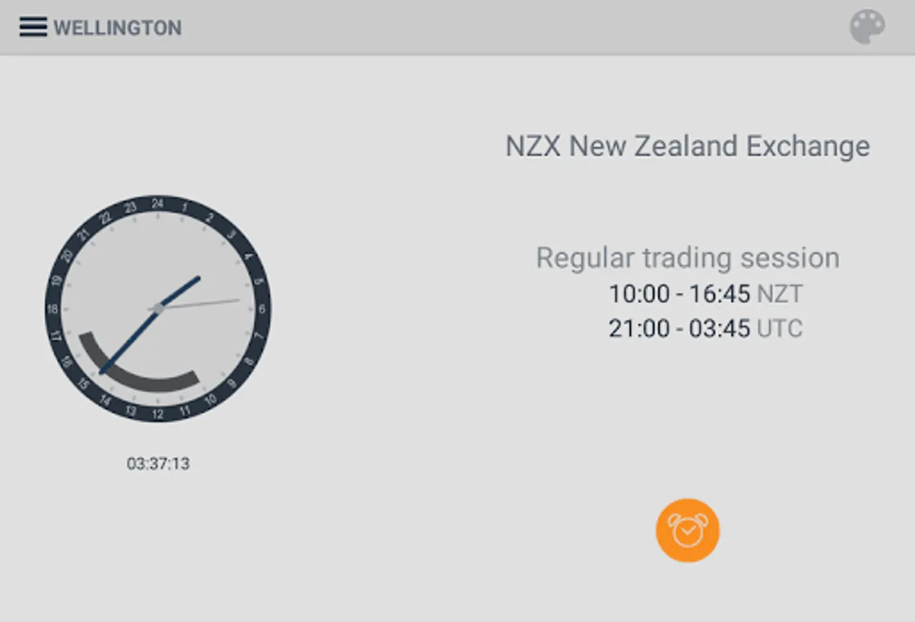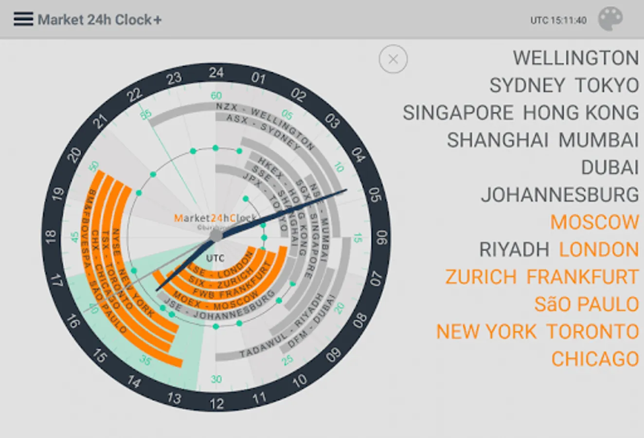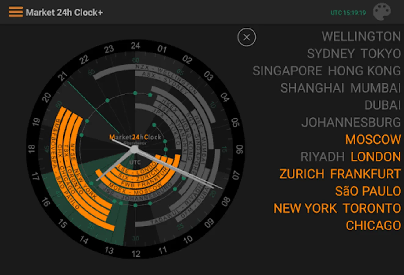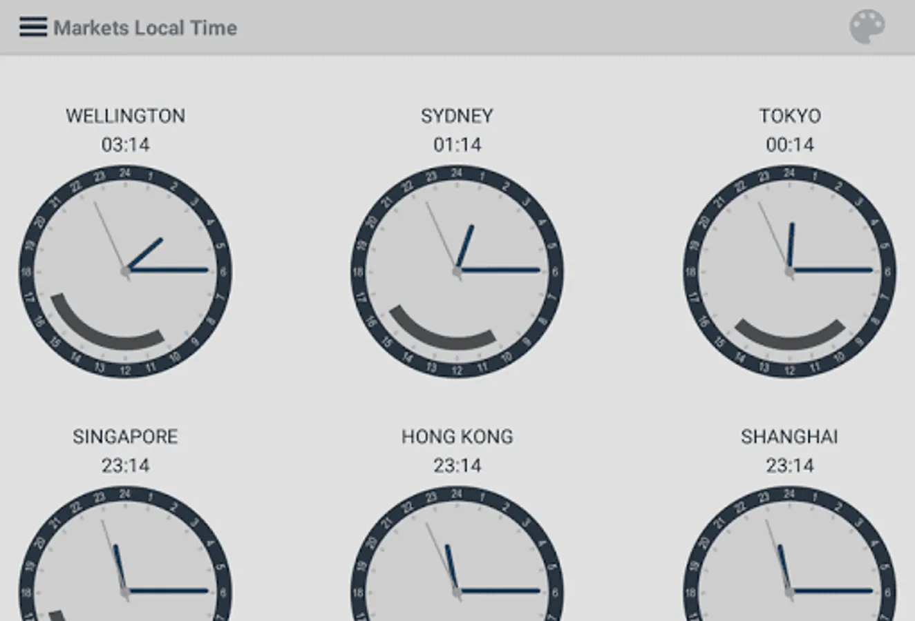 - Market 24h Clock with a list of markets beneath, which you can tap on to load main info about Regular Trading Sessions displayed by the Clock.