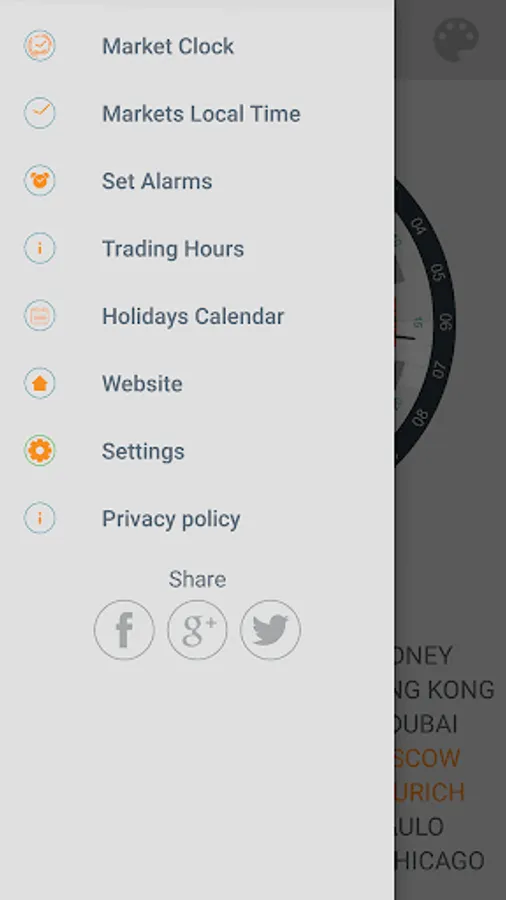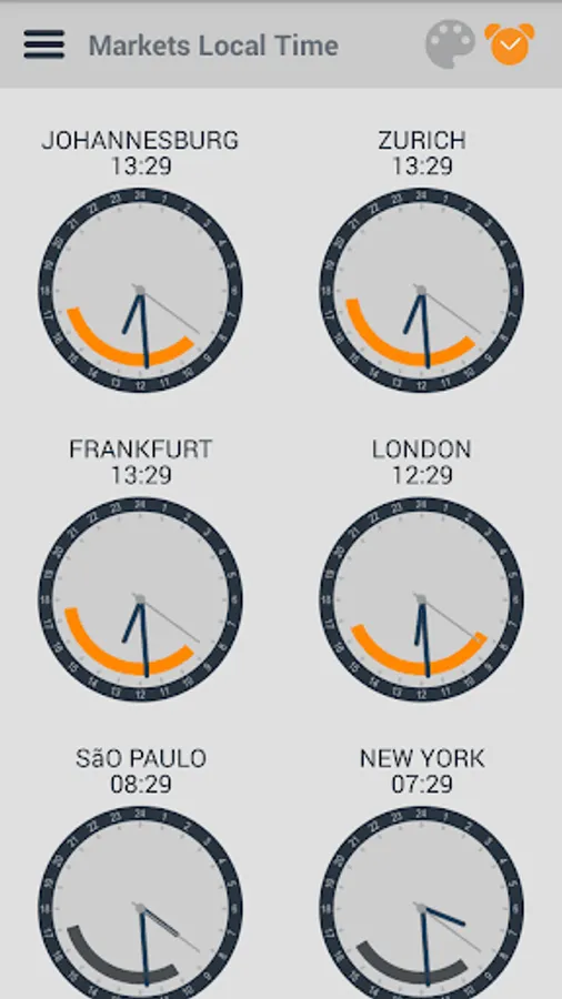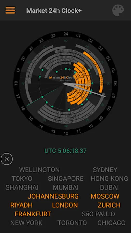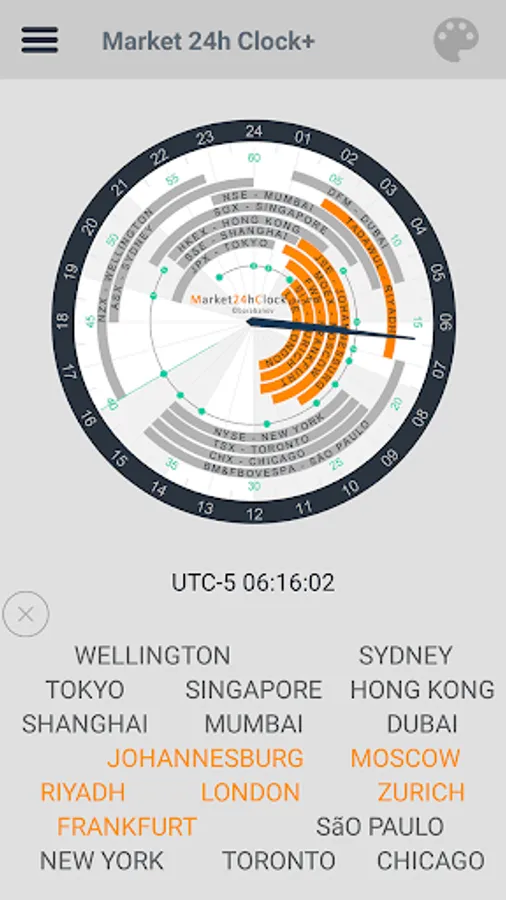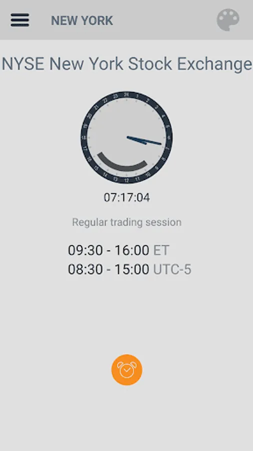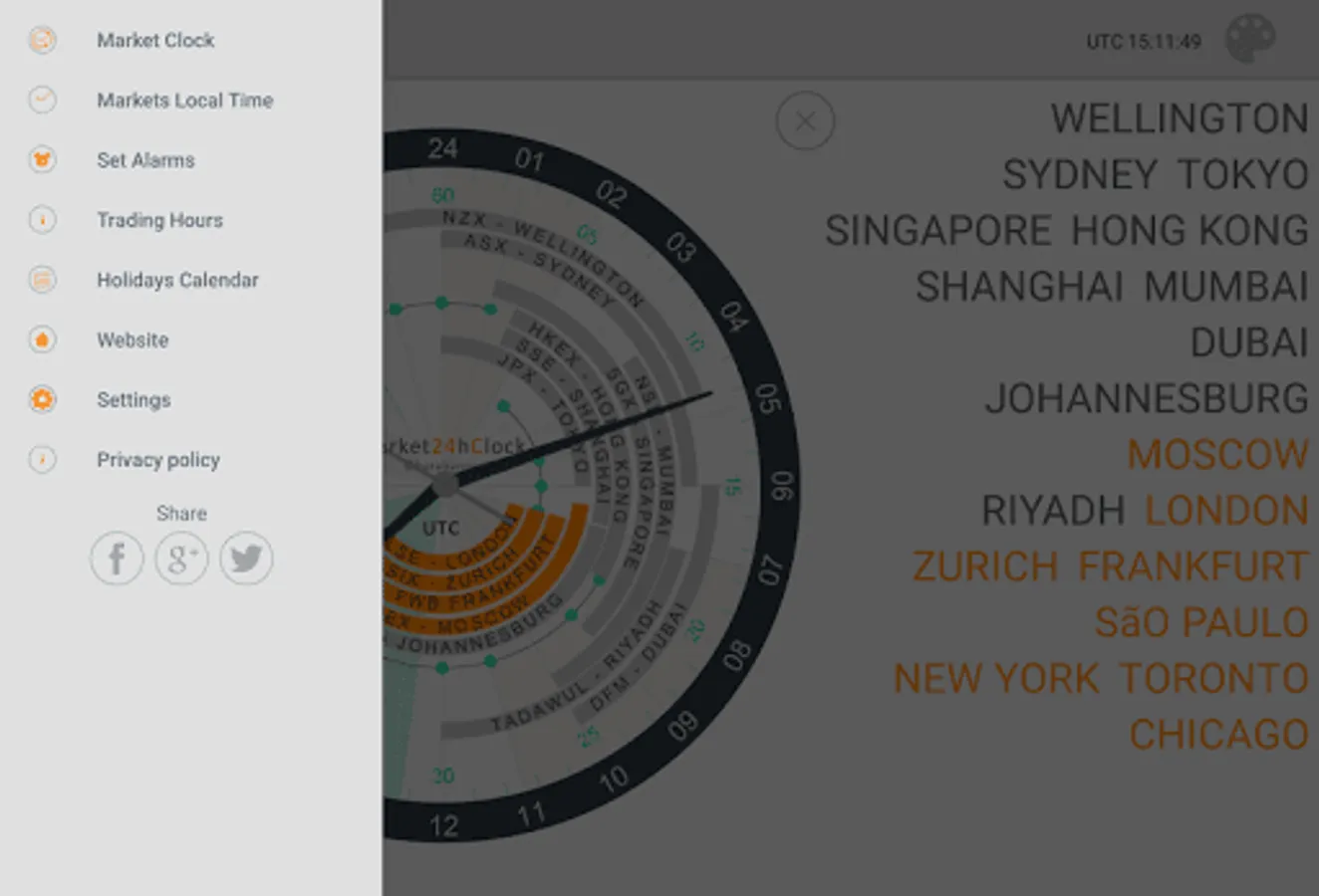 - Market 24h Clock with a list of markets beneath, which you can tap on to load main info about Regular Trading Sessions displayed by the Clock.