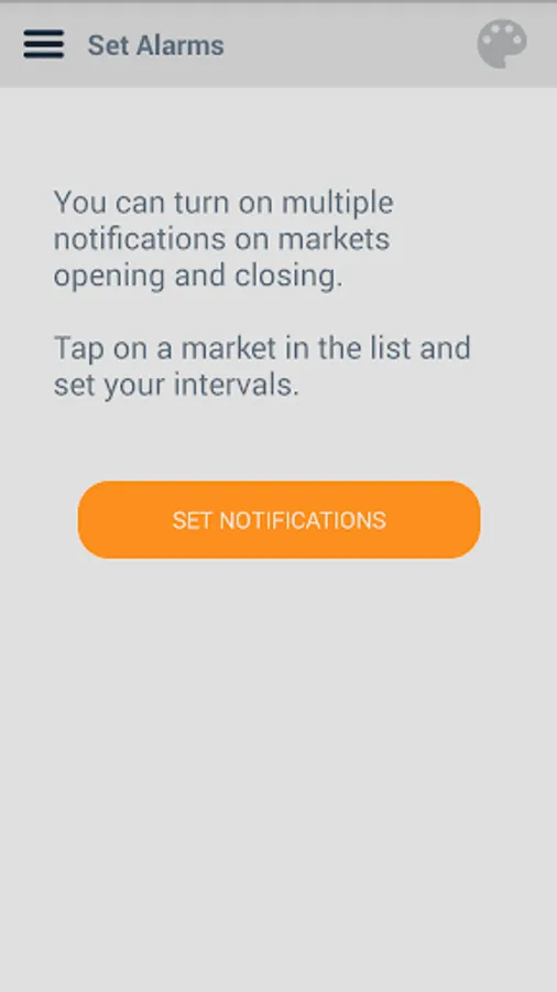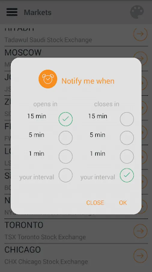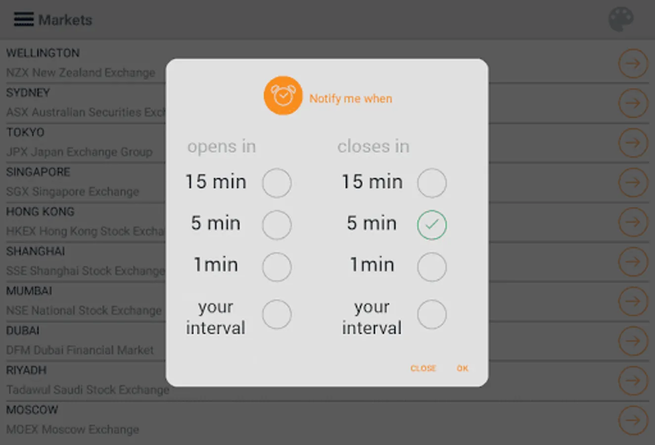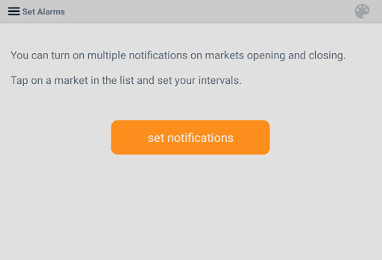 You can set multiple notifications, any time interval (in minutes), for opening and closing of any particular market. Alarms are easily managed.