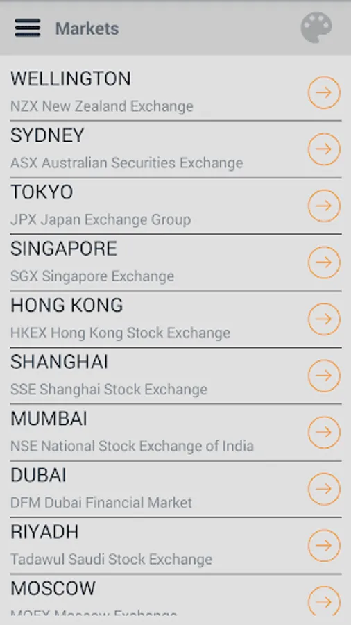 List of 18 Stock and Financial Markets. Tap on any market to see its current status, local time and trading hours both local (for a market) and in your time zone.