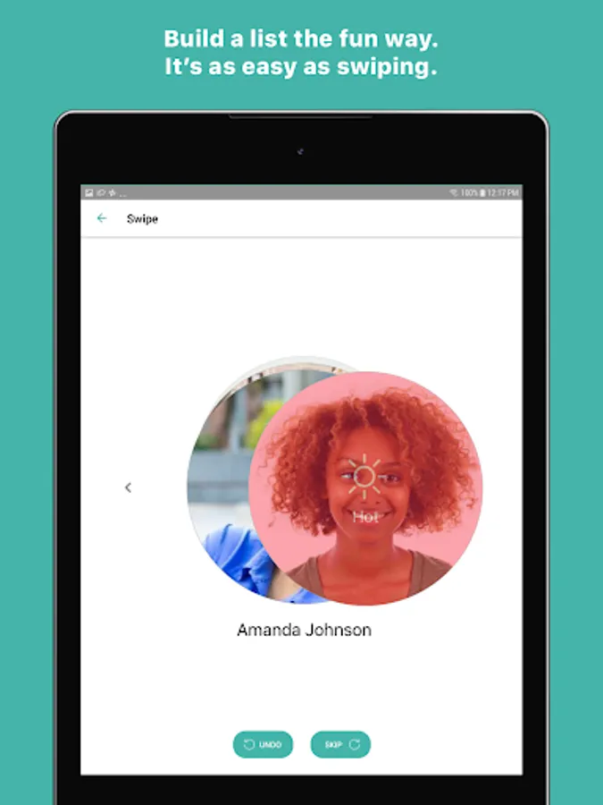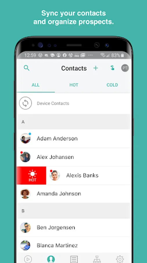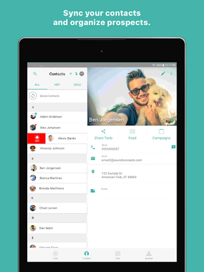 Contacts: Choose how to sync and manage your contacts. Swipe to sort them by interest level. You can make connections, add notes, or check out the Contact Feed to see the tools you've shared and contact actions.