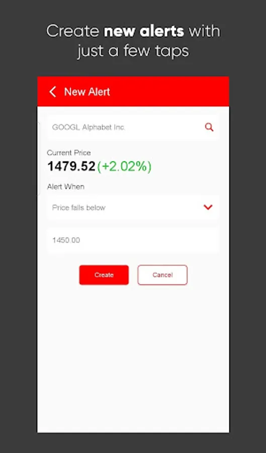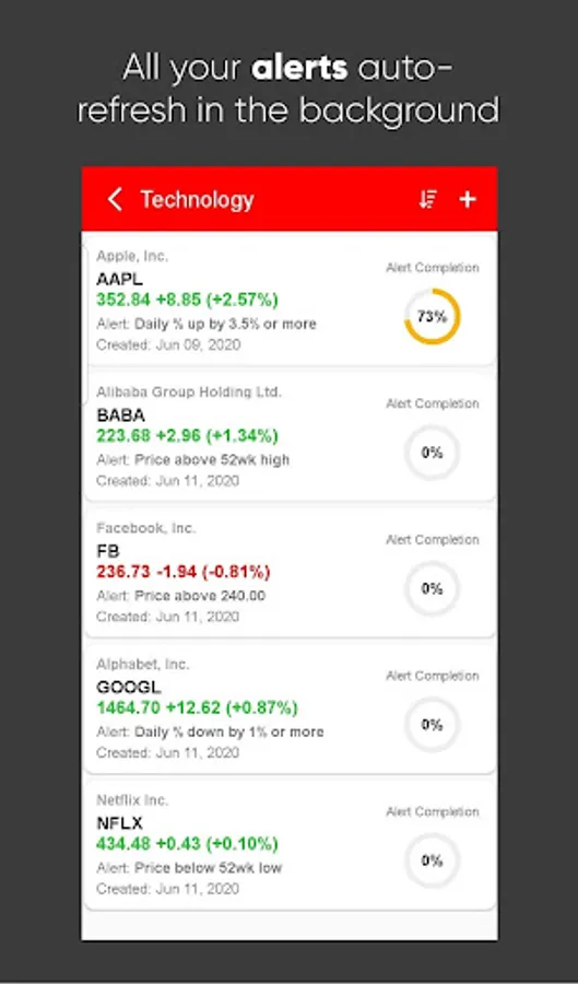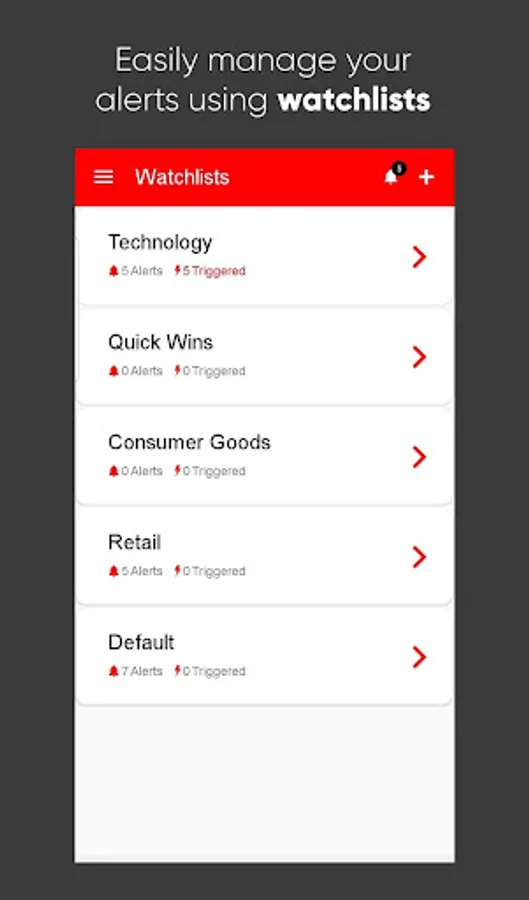Create custom watchlists for different parts of your portfolio and set conditions for the stock quotes notifications (you can select alerts when the price goes up or down).