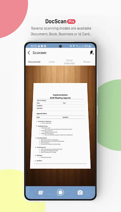 Several image processing modes are available, ScanDoc Pro allows you to transform your documents, books, business cards or identity documents into electronic documents.